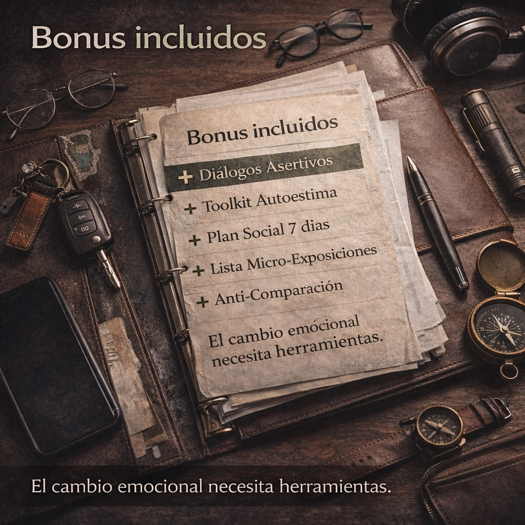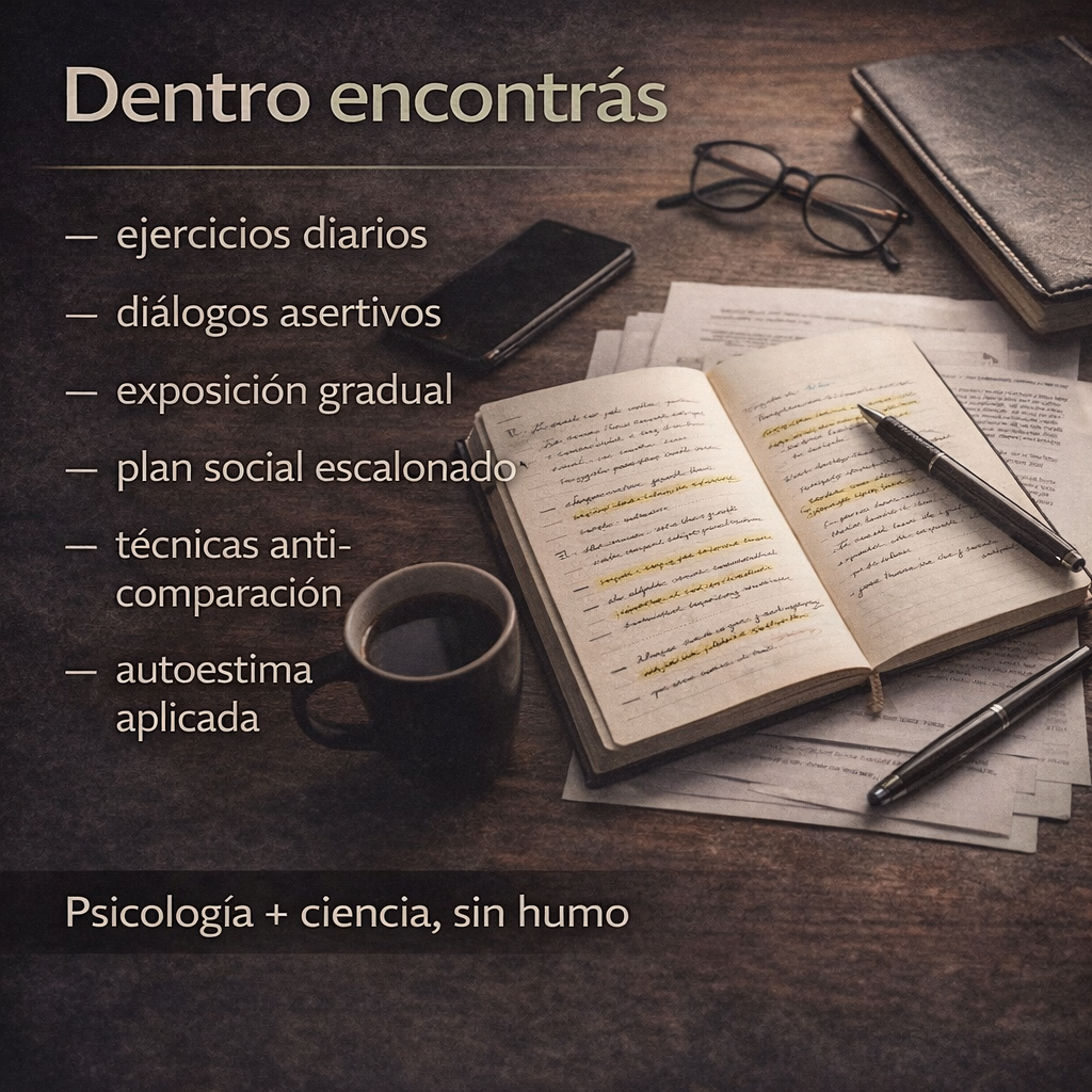 Por ejemplo, un día trabajás en dejar de castigarte después de una conversación, y otro día hacés un mini reto controlado de hablar con alguien nuevo, con guía exacta de qué decir.